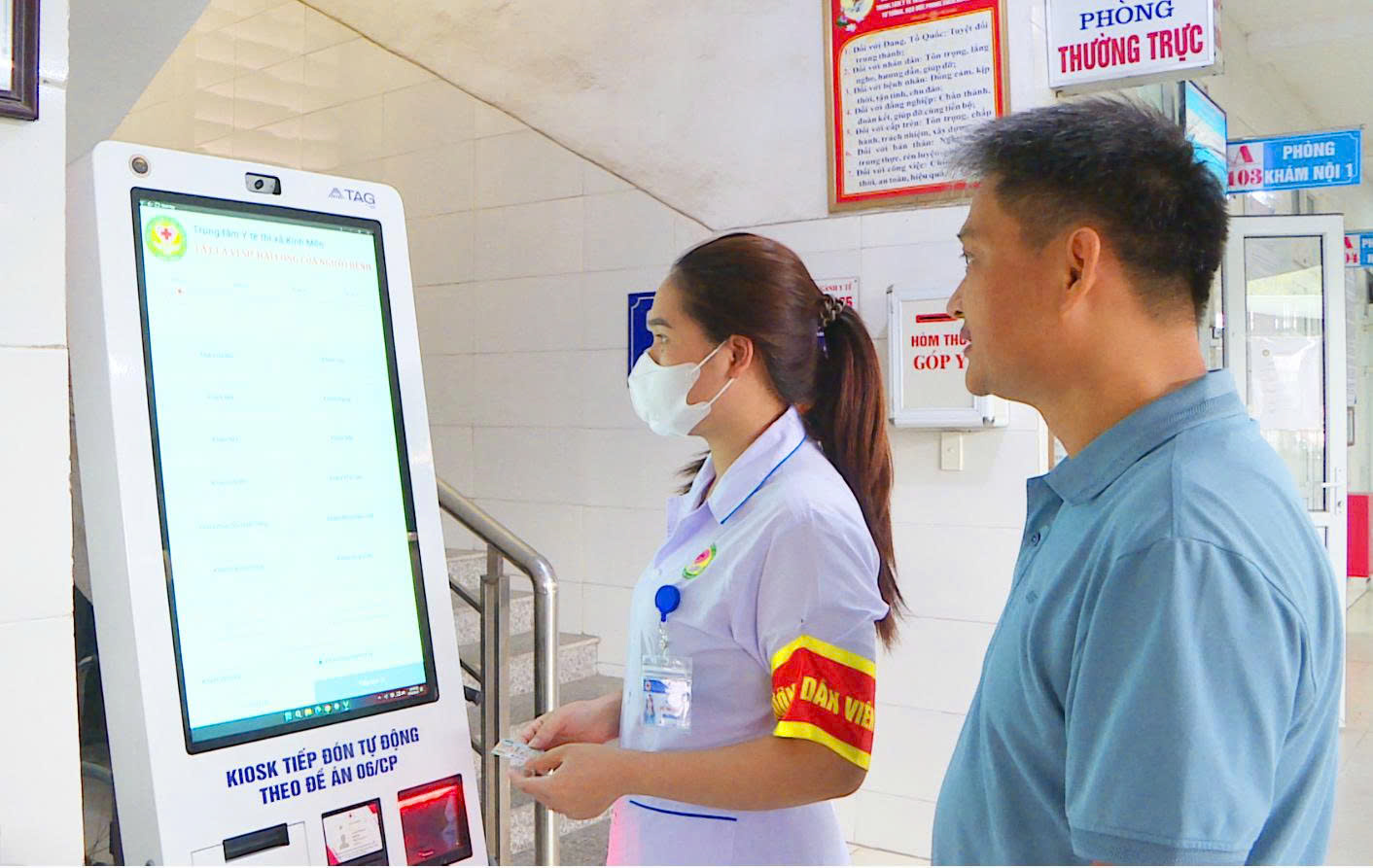 Cán bộ Trung tâm Y tế Kinh Môn hướng dẫn ông Vũ Văn Đương đăng ký khám bệnh qua Kiosk điện tử