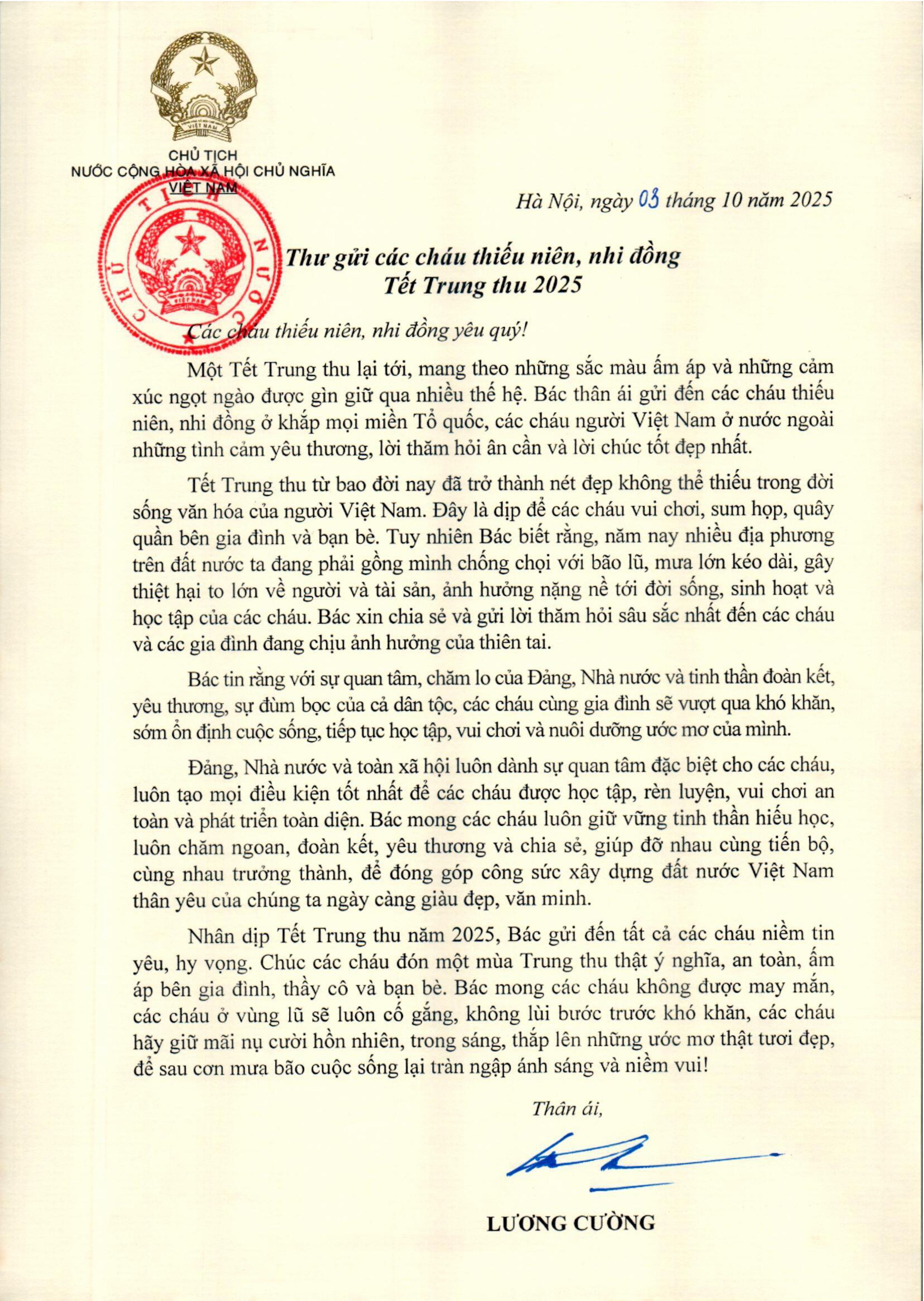 Chủ tịch nước Lương Cường gửi thư chúc các cháu thiếu niên, nhi đồng Tết Trung thu 2025